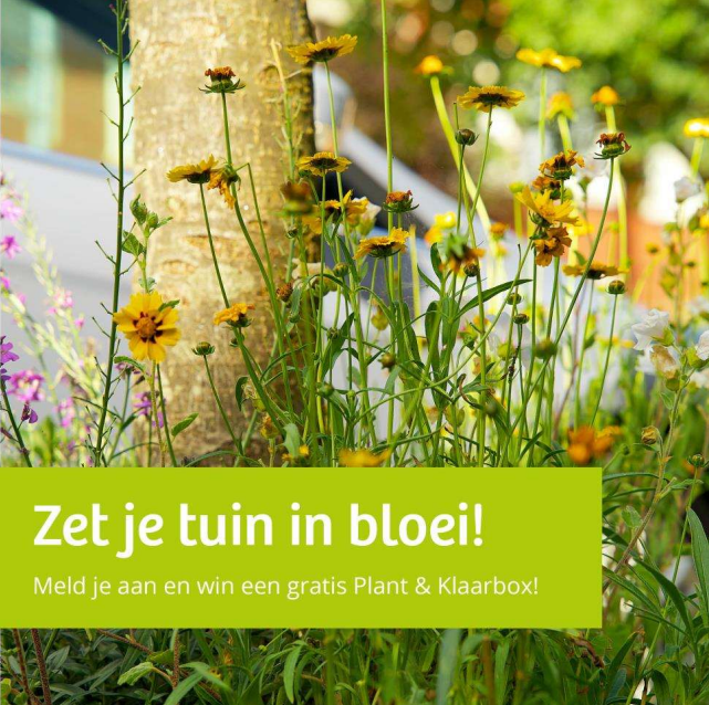 In de Plant & Klaarbox – een biologisch (gifvrij) plantenpakket – zit een struik, vaste planten en aarde, waarmee 1 m2 van de tuin te vergroenen is. De planten in het pakket zorgen voor mooie planten van het voorjaar tot het najaar.