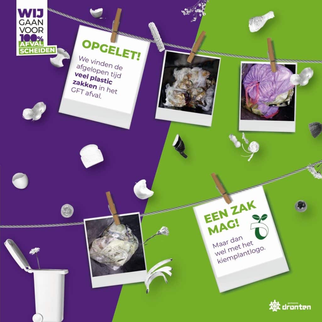 De gemeentelijke site geeft verder aan dat er veel plastic zakken in het GFT-afval gevonden worden. Bij voorkeur wordt het GFT-afval zonder zak in de container afgevoerd. Indien men het GFT-afval wil afvoeren in een zak, gebruik een andere zak.