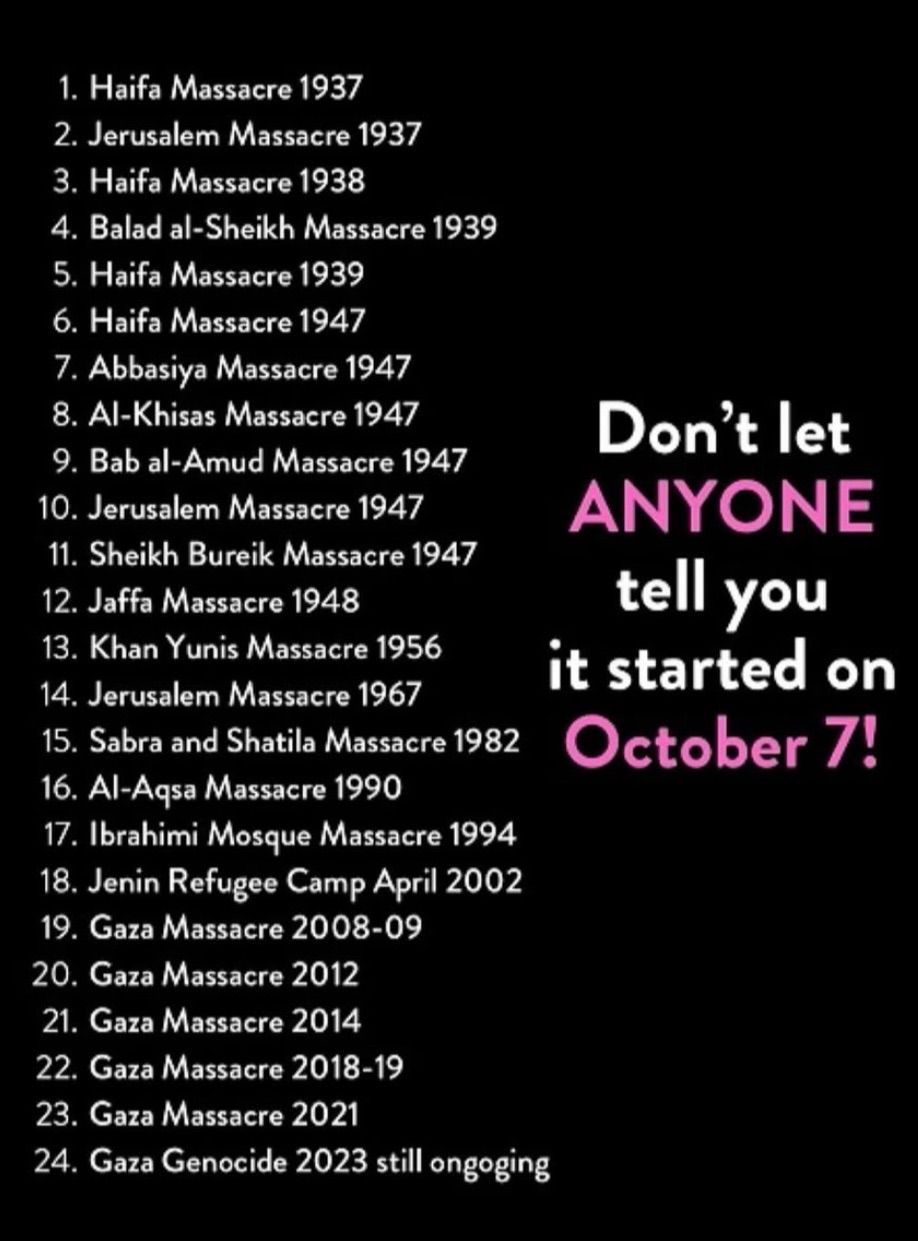 Het aantal bloedbaden gaat nog veel en veel verder en dan blijven mensen zeggen dat de oorlog is begonnen op 7 oktober 2023. Dit is niet meer houdbaar; neem bijvoorbeeld nog eens de aanval van de bezetter van Palestina op Gaza in 2014. Hierover wordt gemeld dat 75 procent van de 1088 Palestijnen die gedood werden, burgers waren. Daarentegen zijn van de 51 mensen die door de Palestijnse aanvallen gedood werden, 48 IDF militairen en dat is 94 procent.