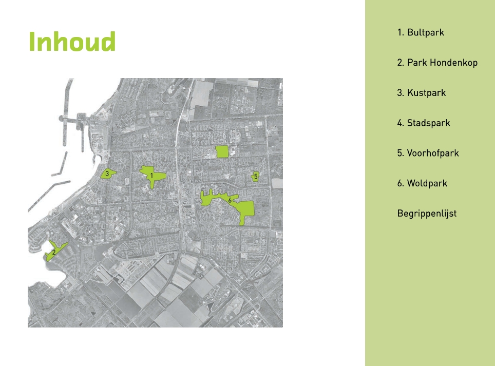 De gemeente heeft laten weten dat in het Parkenplan in ieder geval de volgende parken komen te staan: Woldpark, Bultpark, Stadspark, Kustpark, Park Hondenkop, Voorhofpark / Fjordpark en in Warande Elzenpark, Esdoornpark en Olmenpark. Wethouder Kruis meldt dat het Zilverpark voornamelijk een vijver is – in de buurt van het stadshart – met een groenstrook met Lindes; dat het Bultpark wordt verzorgd door een comité om allerlei soorten beplanting te laten groeien en in het Woldpark is nogal sport en recreatie te vinden.
