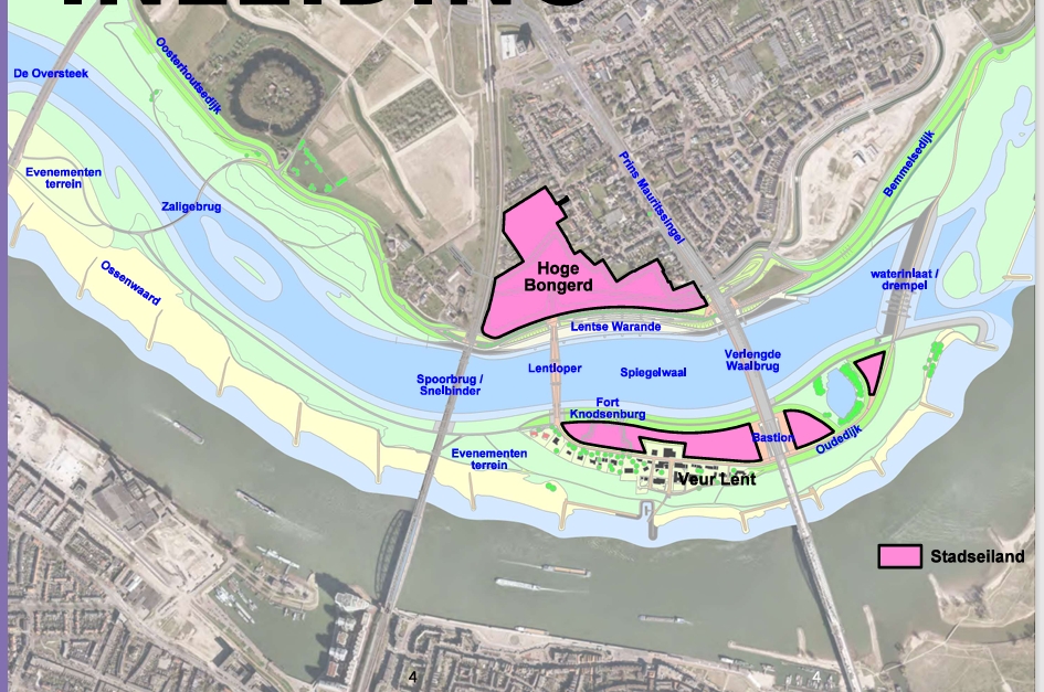 Nijmegen streeft naar naar de hoogst mogelijke leef- en verblijfskwaliteit voor Stadseiland, waarbij er 2 deelgebieden zouden komen, onder meer voor Veur-Lent. Voor de ontwikkeling van Veur-Lent had men een gecombineerde functie van het eiland als woongebied en verblijfs- en recreatiegebied in gedachten. Verderop in het document meldt de gemeente dat het landschap van dit deel als uitgangspunt genomen zou worden, waarbij in eerste instantie een aantrekkelijk landschapsbeeld ontworpen zou worden, die daarna het casco moet vormen voor de bebouwing die er aan toegevoegd zou worden.
